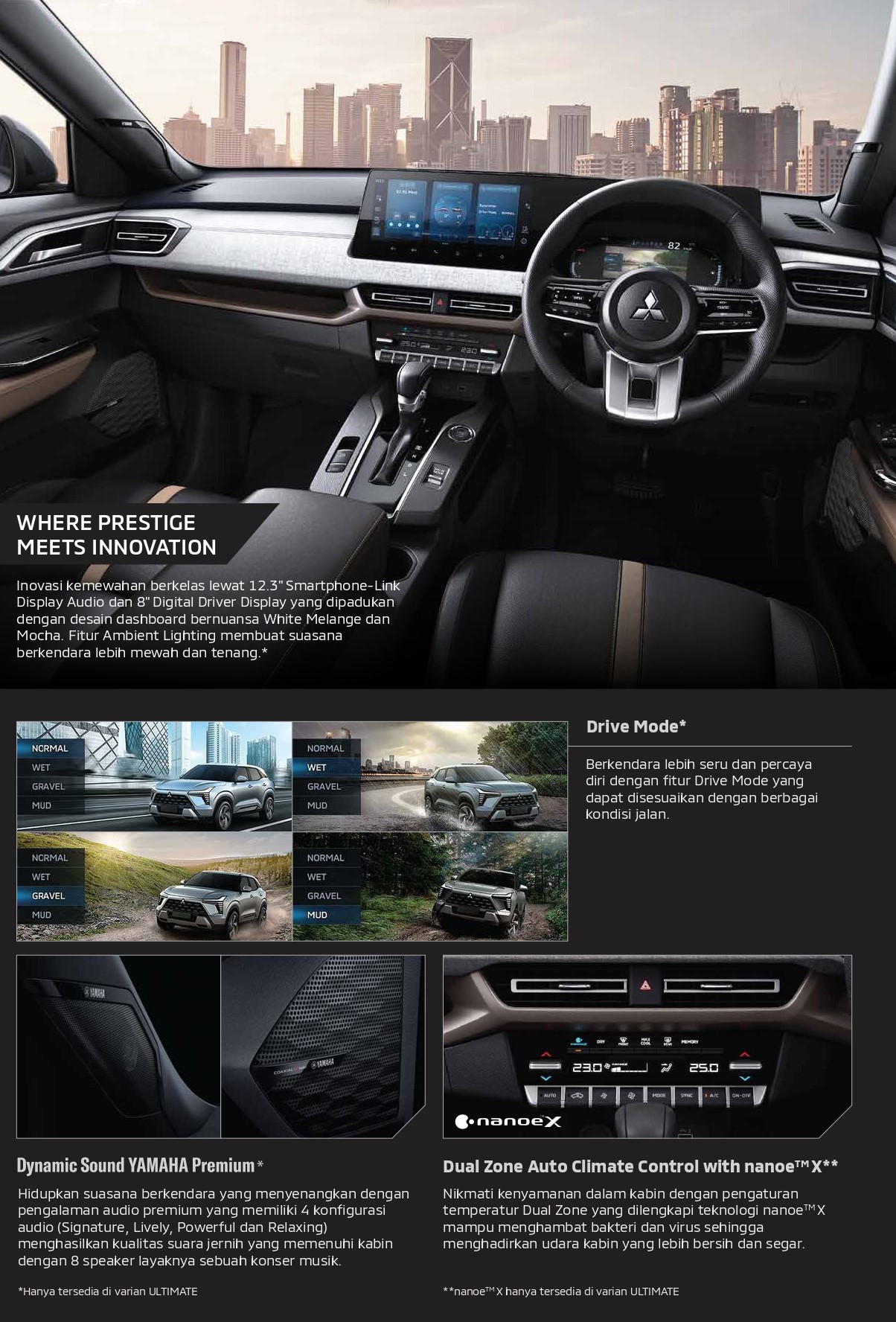 - Dynamic Sound Yamaha Premium, sebuah sistem audio yang dikembangkan atas kolaborasi semangat dan teknologi Mitsubishi Motors dengan Yamaha, melibatkan engineer Mitsubishi Motors dan Yamaha Sound Meister, menciptakan dynamic sound untuk sistem audio tingkat tinggi. Dilengkapi dengan 8 speaker terintegrasi dan 4 Preset Equalizer (Signature, Lively, Powerful, Relaxing) yang dapat disesuaikan dengan mood pengendara, serta fitur Speed Compensated Volume (SCV).