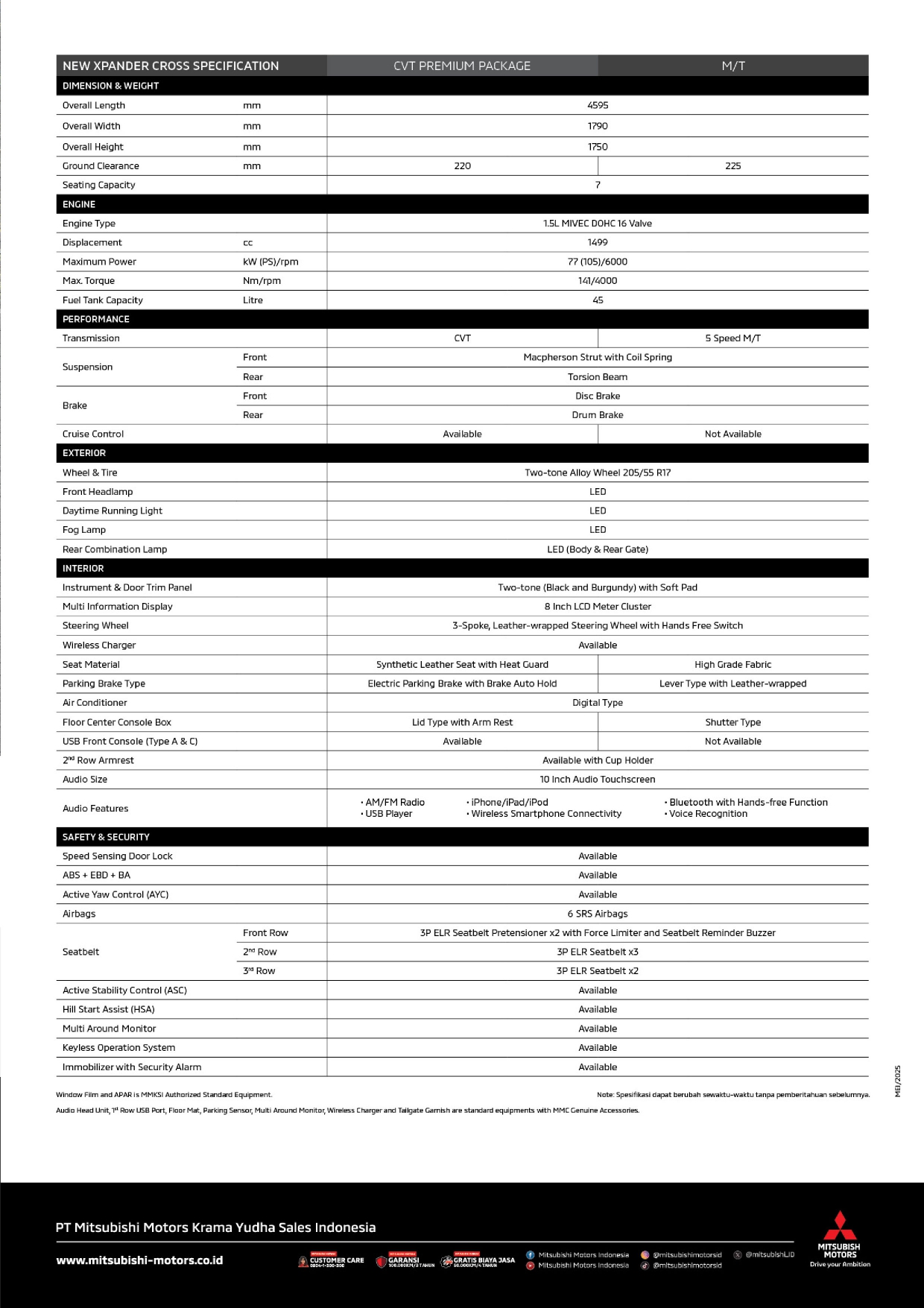 Spesifikasi dan fitur utama Mitsubishi Xpander Cross 2025. Lihat spesifikasi mesin, dimensi, fitur keamanan dan teknologi secara rinci di bawah.