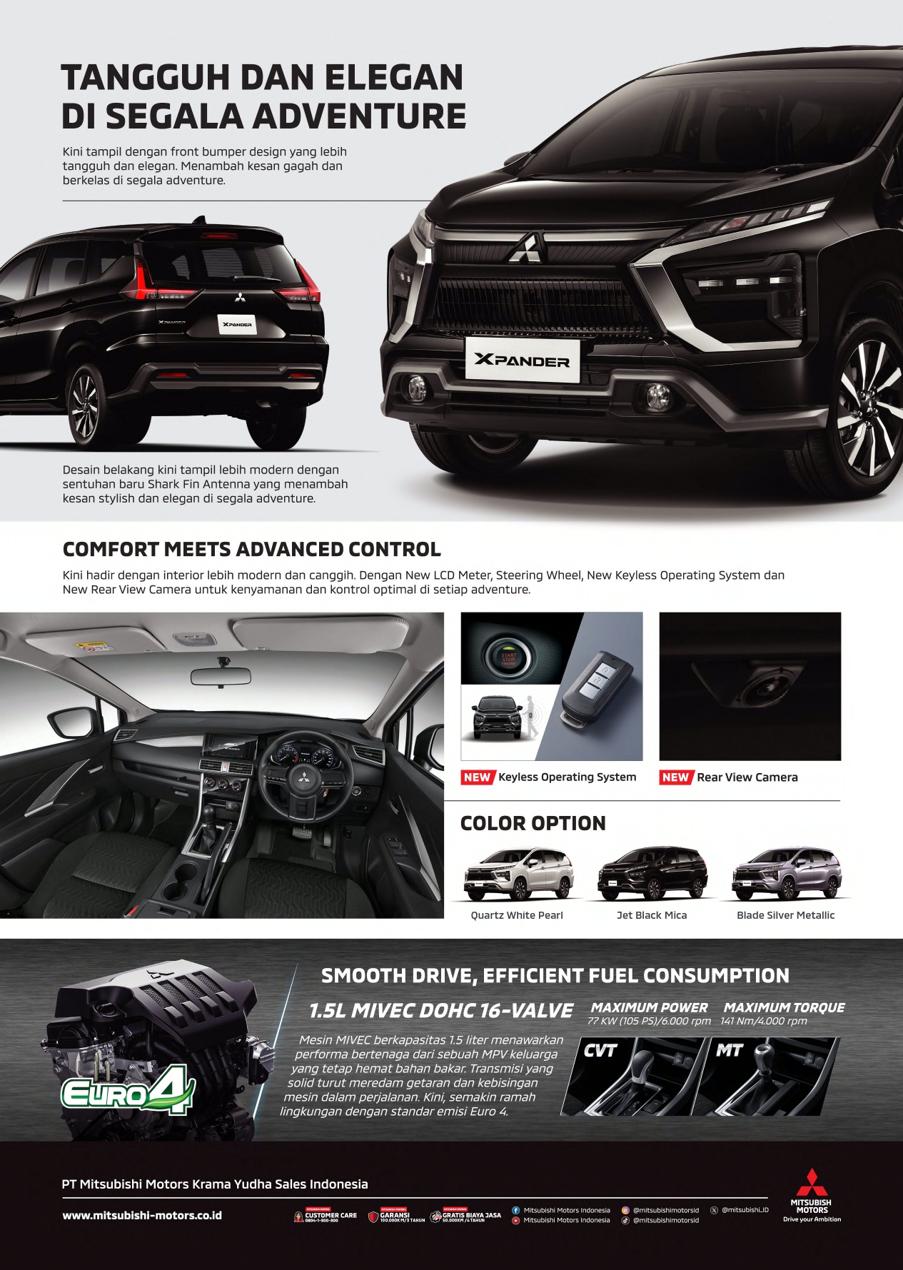 Selain itu, New Xpander menawarkan kemewahan dan kenyamanan pada sisi interior dengan kabin berkualitas tinggi. Terlihat ruang interior yang luas dengan total 19 ruang penyimpanan, serta pilihan konfigurasi kursi terbaik di kelasnya, memberikan kemudahan dan utilitas maksimal. Selain itu, New Xpander dibekali dengan pilihan transmisi New CVT, untuk pengalaman berkendara yang lebih nyaman, menyenangkan, memberikan efisiensi dan kenyamanan tinggi.